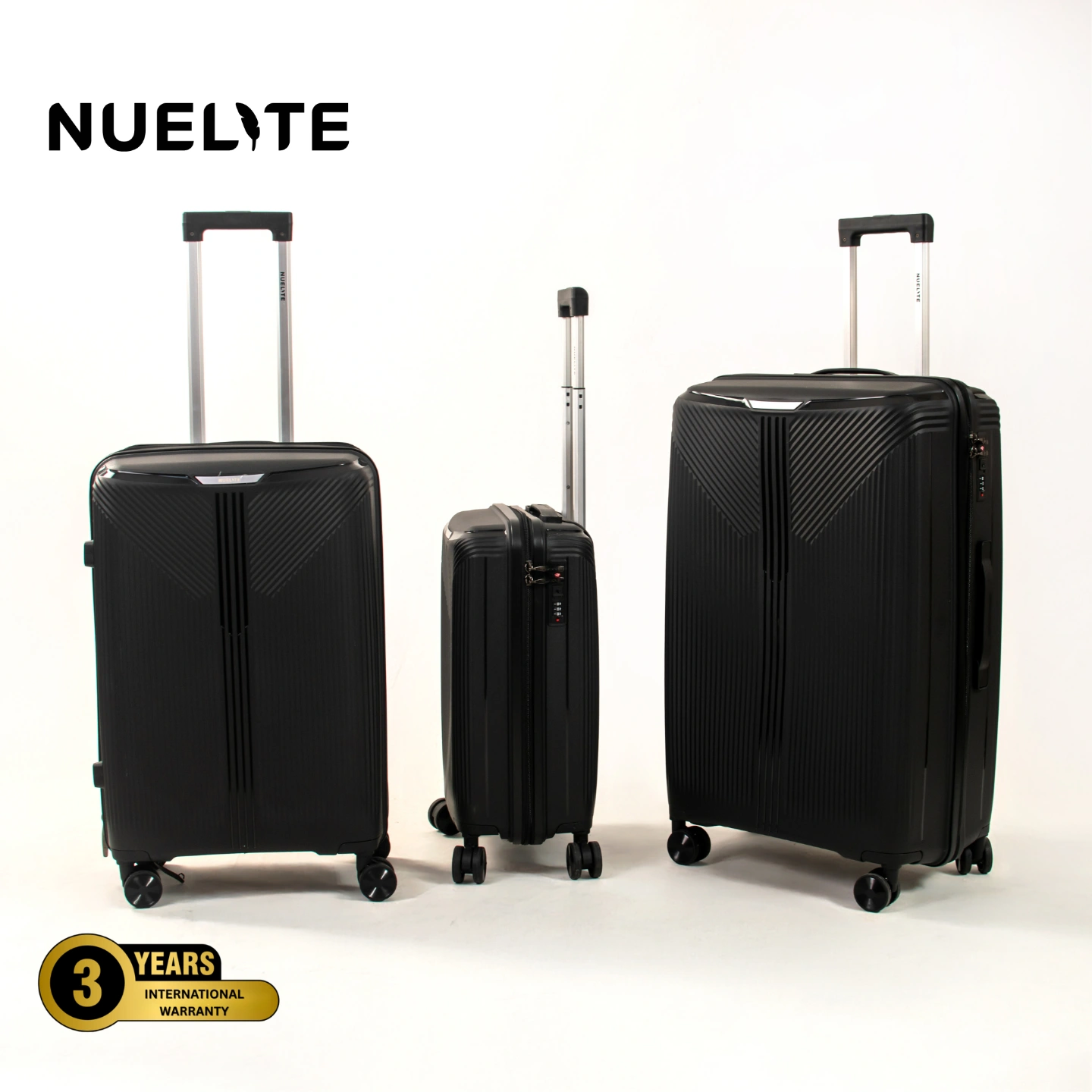 NUELITE NARITA Set of 3 Luggage | 8 Wheel Spinner Trolley Bag | Anti-Theft Zipper Integrated Lock Extra Security | Hard Shell Suitcase Black